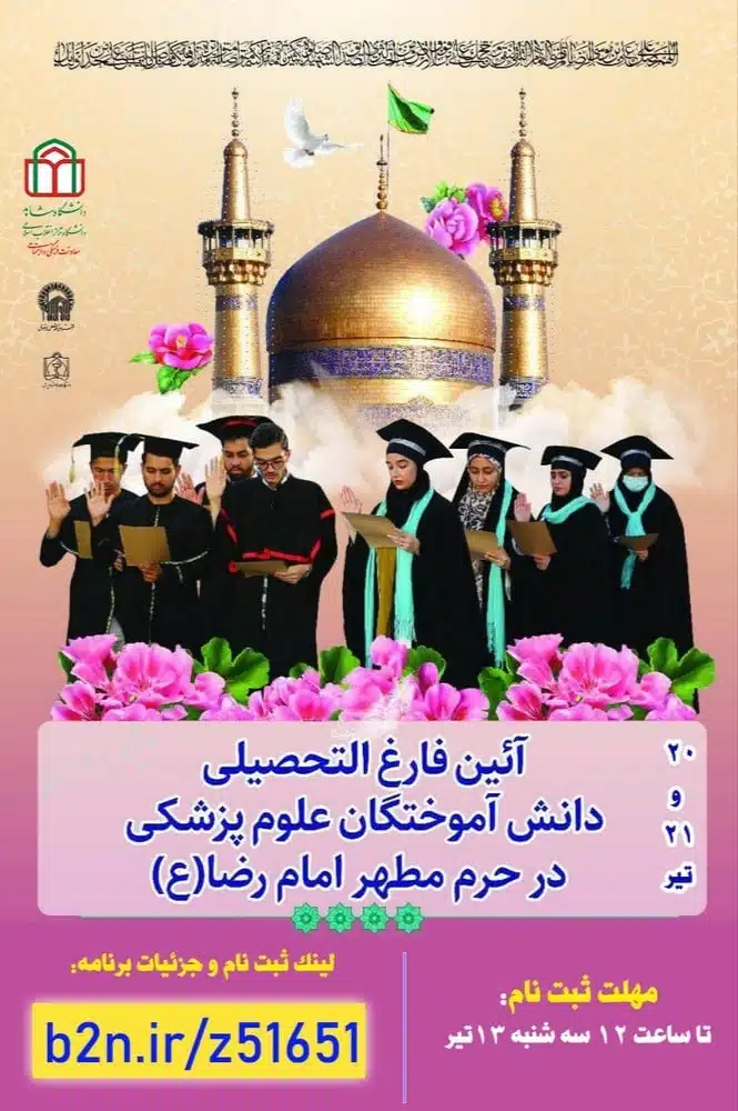 به گزارش معاونت فرهنگی وزارت بهداشت، درمان و آموزش کشور، دومین جشن فارغ التحصیلی ویژه دانشجویان دانشگاه های علوم پزشکی سراسر کشور در جوار حرم مطهری رضوی(ع) برگزار می گردد. این مراسم چهارشنبه 21 تیر ماه از ساعت 15 تا 18 در حرم مطهر رضوی با حضور نمادین دانش آموختگان گرامی برگزار می شود. دانشجویان علوم پزشکی دانشگاه شاهد نیز که دارای شرایط بوده، می توانند جهت ثبت نام به آدرس زیر مراجعه فرمایند:b2n.ir/z51651(ظرفیت محدود می باشد) مهلت ثبت نام: تا ساعت ۱۲ سه شنبه ۱۳ تیر